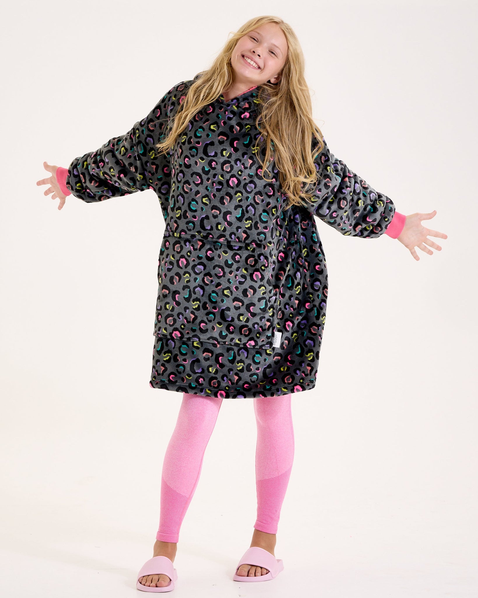 Unleash your wild side with the Snuggz Kids Original Leopard Print Hooded Blanket. With a dark grey base and colourful leopard spots, this oversized hoodie blanket is bold, fun and seriously snuggly - the perfect wearable blanket hoodie for sofa days, movie nights and lazy weekends.