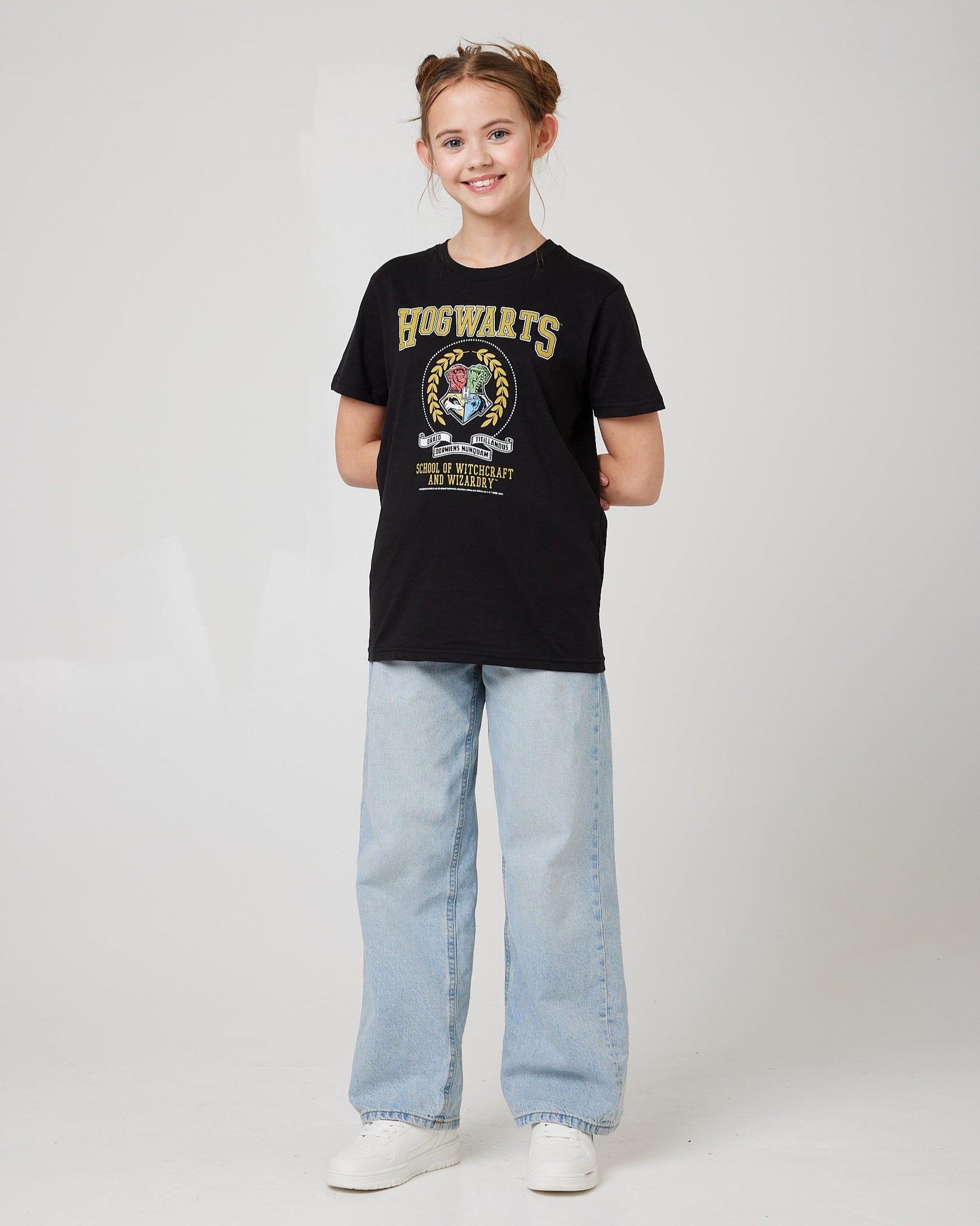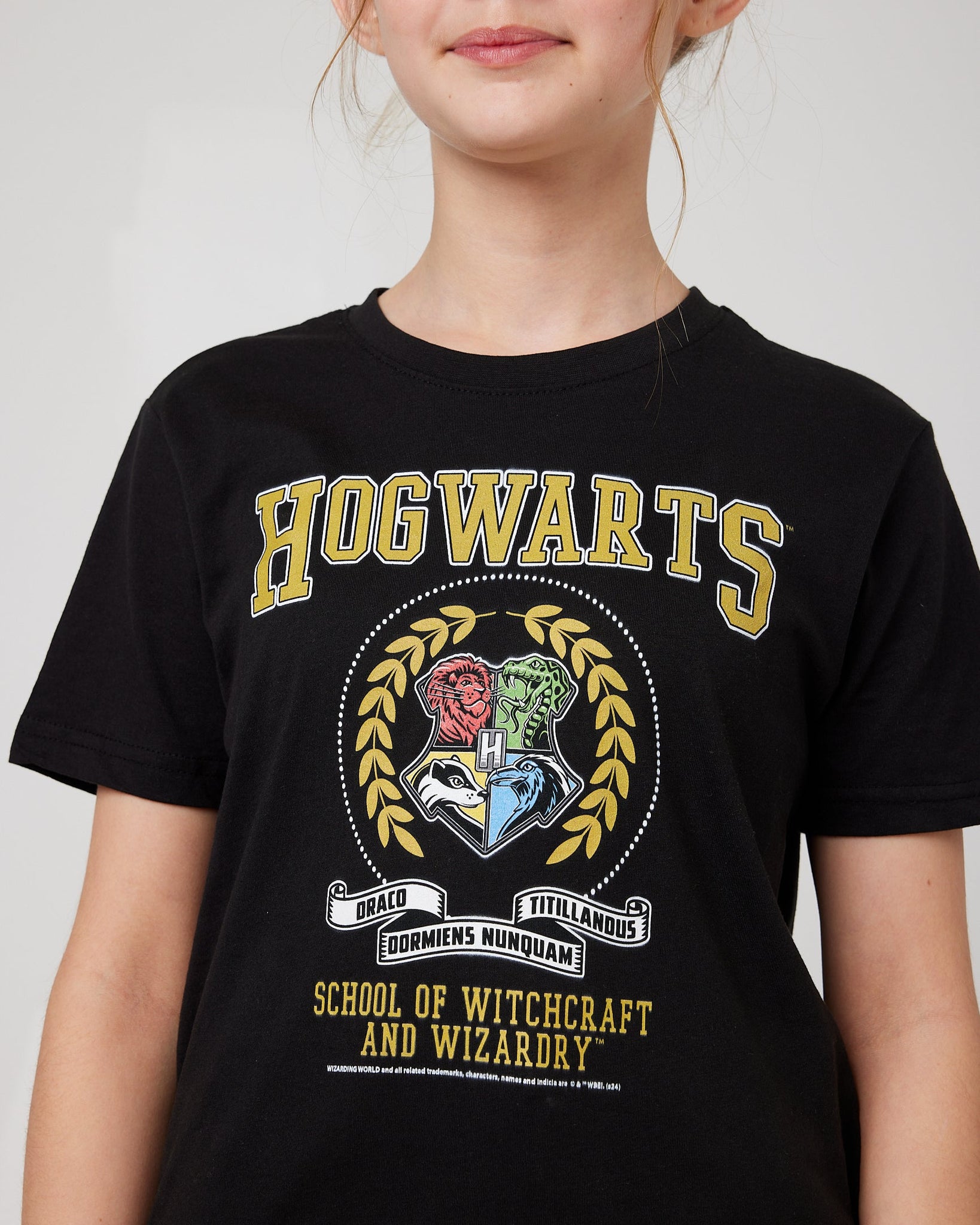 Hogwarts School Crest – Bold central print with “Witchcraft & Wizardry” slogan