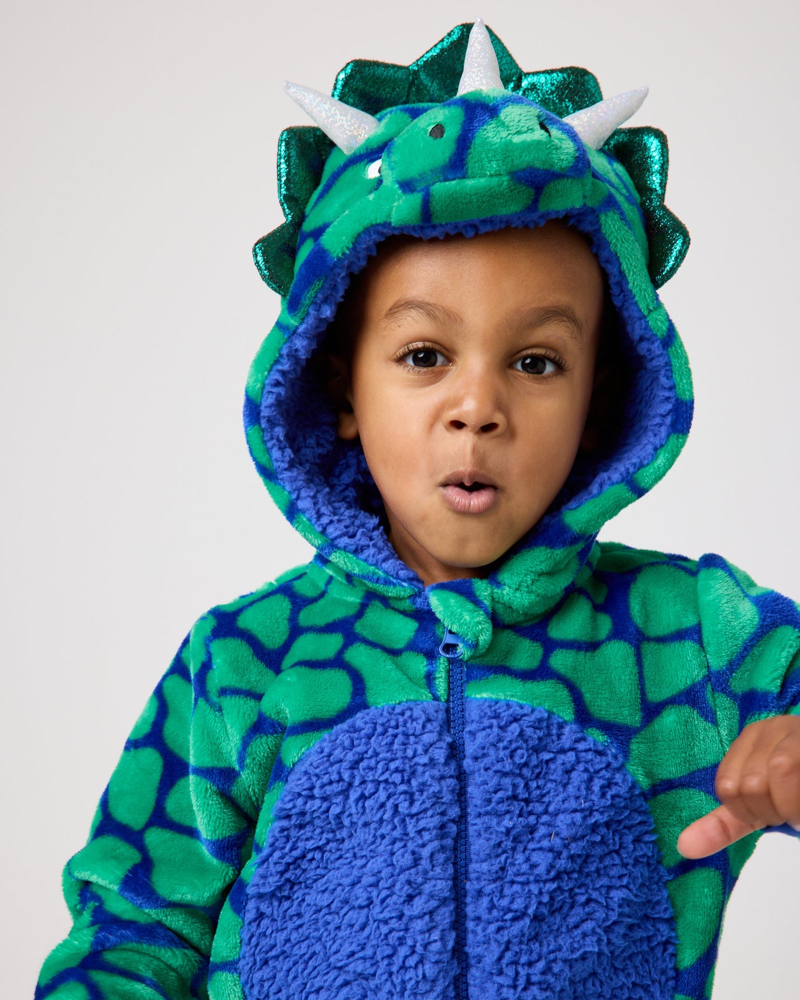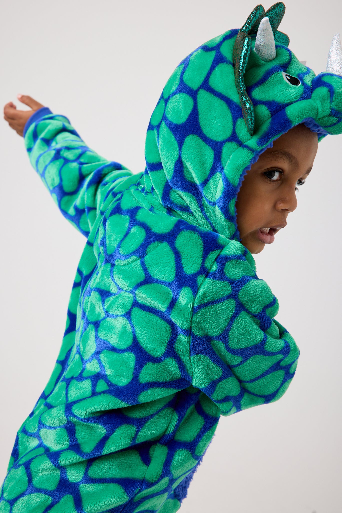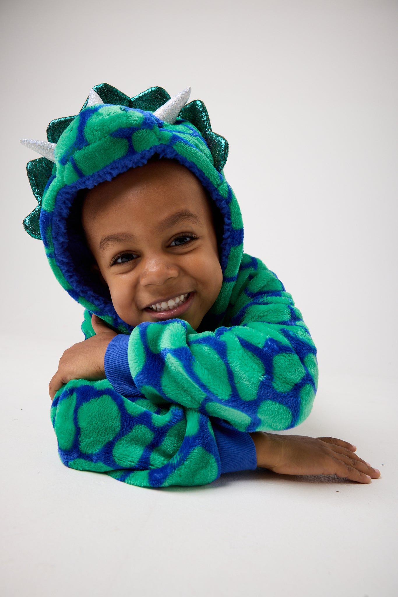 Hear them Rooooaaaarrrr in our green dinosaur childrens' onesie! With extra special features including a scale texture fabric, hood embroidery and detail, and iridescent foil horns, for an out of this world look! Designed with the same oversized style as our hooded blankets, Snuggz Onesies are the ultimate loungewear to snuggle and relax in!