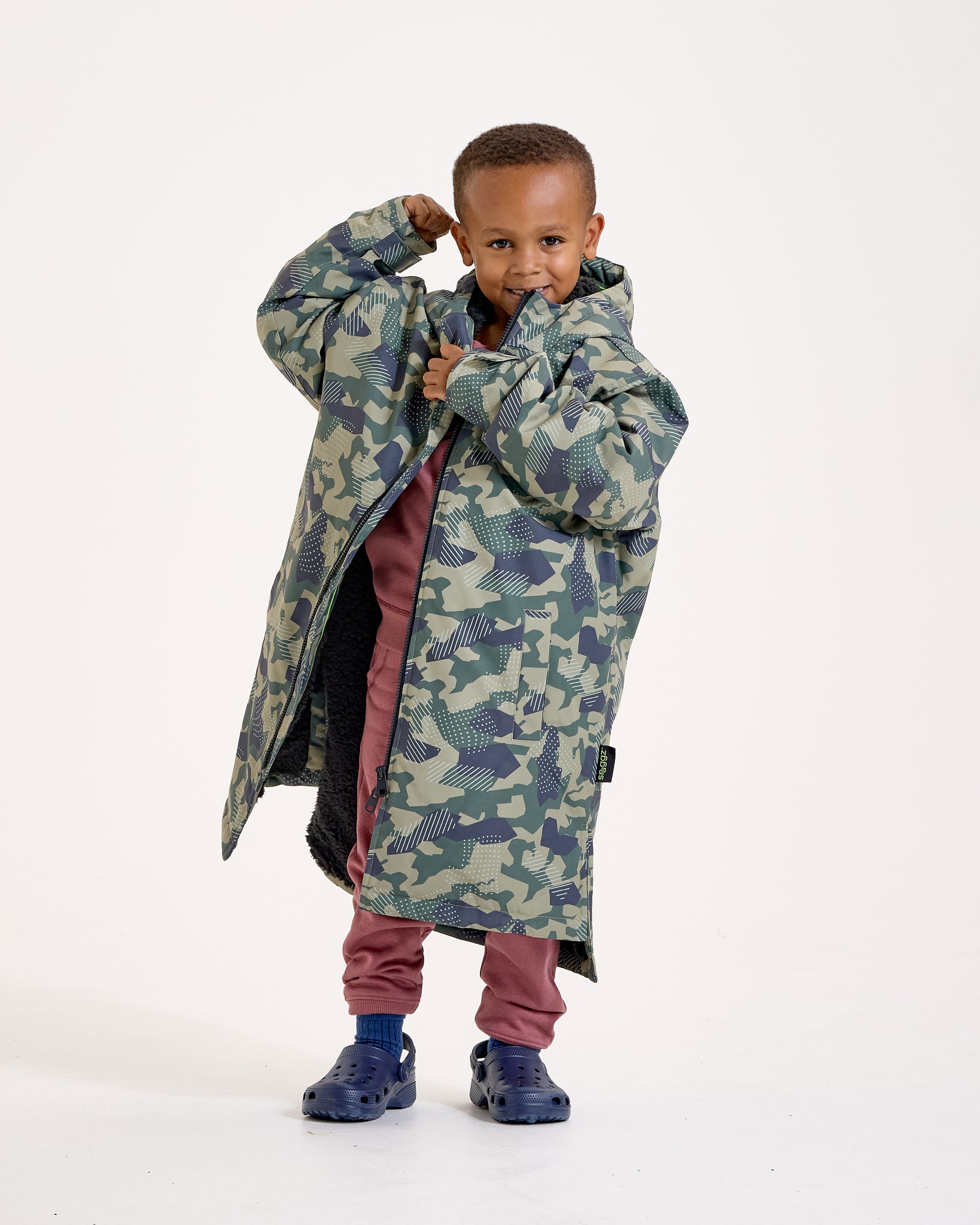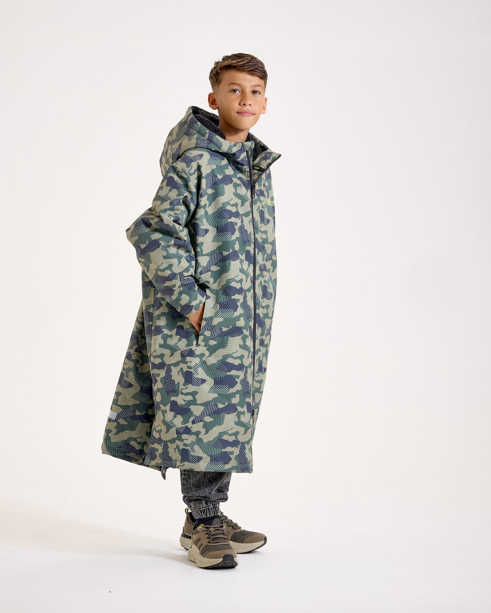 The oversized fit makes it easy for kids to change underneath, while the full-length two-way zip and high-neck hood provide maximum protection against the elements. Whether it’s muddy sidelines or post-swim chills, this camo changing robe keeps kids snug, dry, and ready for their next adventure.