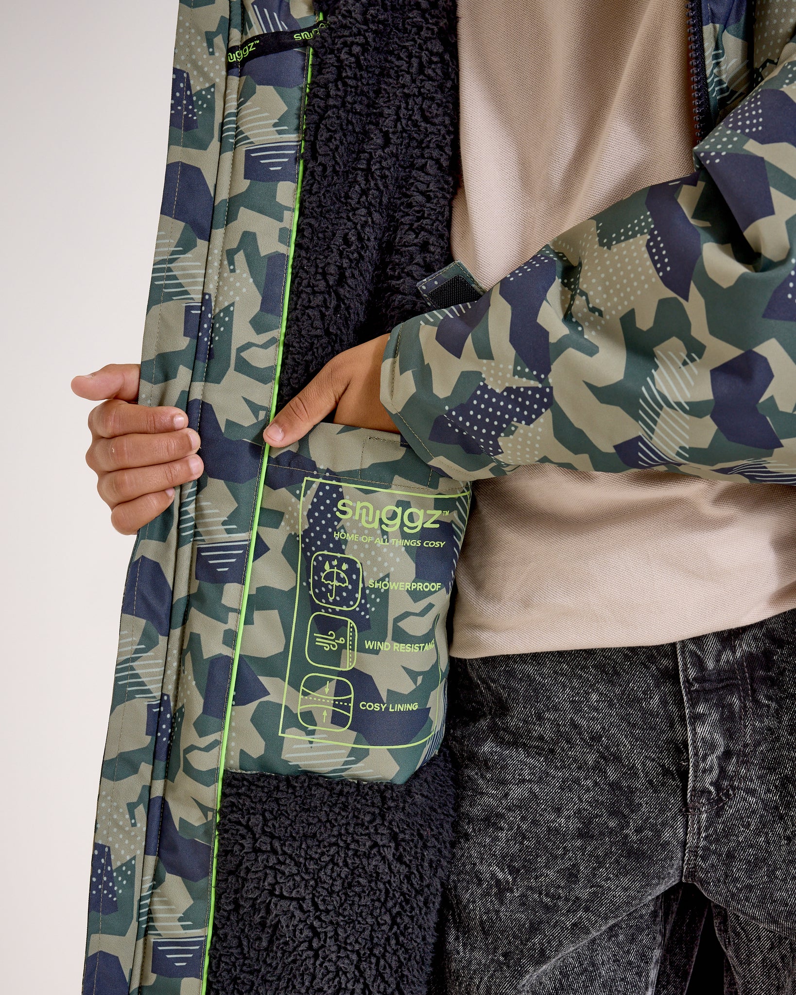 Snuggz Geen Camo Parka offers reliable water-resistant protection, ideal for light to moderate rain. Perfect for everyday wear or short outdoor outings. Not designed for heavy downpours or extended exposure to rain.