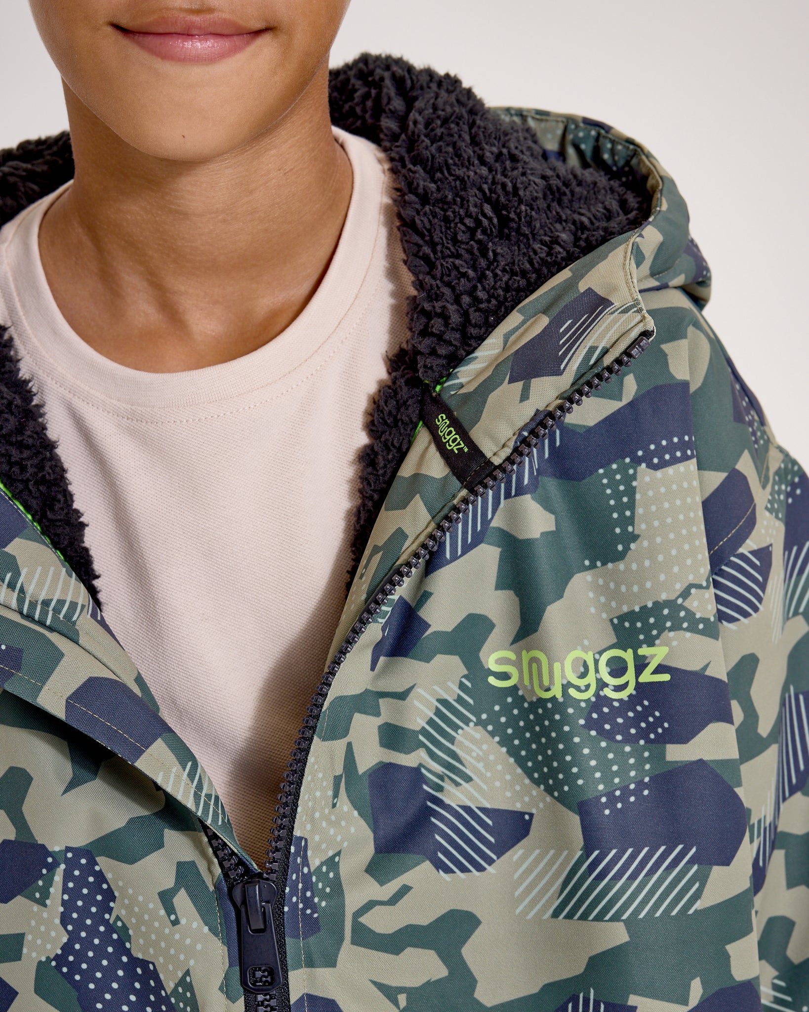 Keep your little adventurers warm, dry, and ready for anything with our Snuggz Kids Lite Green Camo Changing Robe. Designed with a bold camouflage outer and cosy black Borg fleece lining, this wind resistant and showerproof robe is the ultimate outdoor essential. Designed with a reflective strip on the back for added visibility and safety during low-light adventures.
