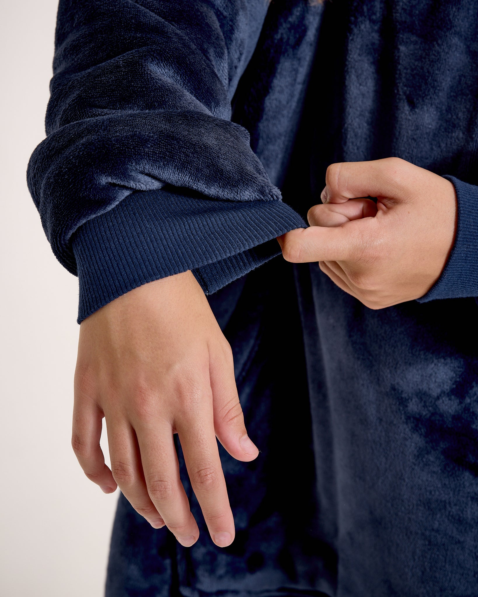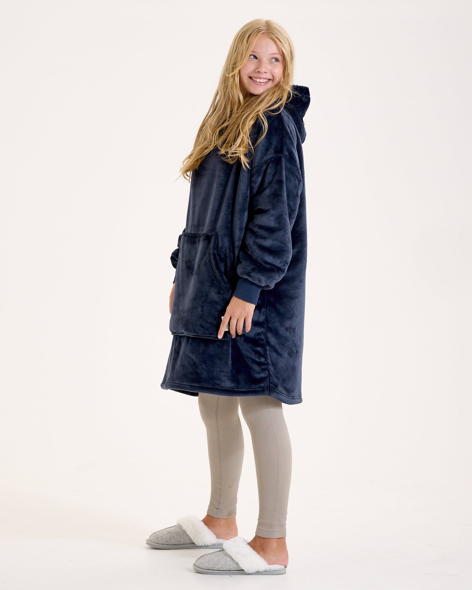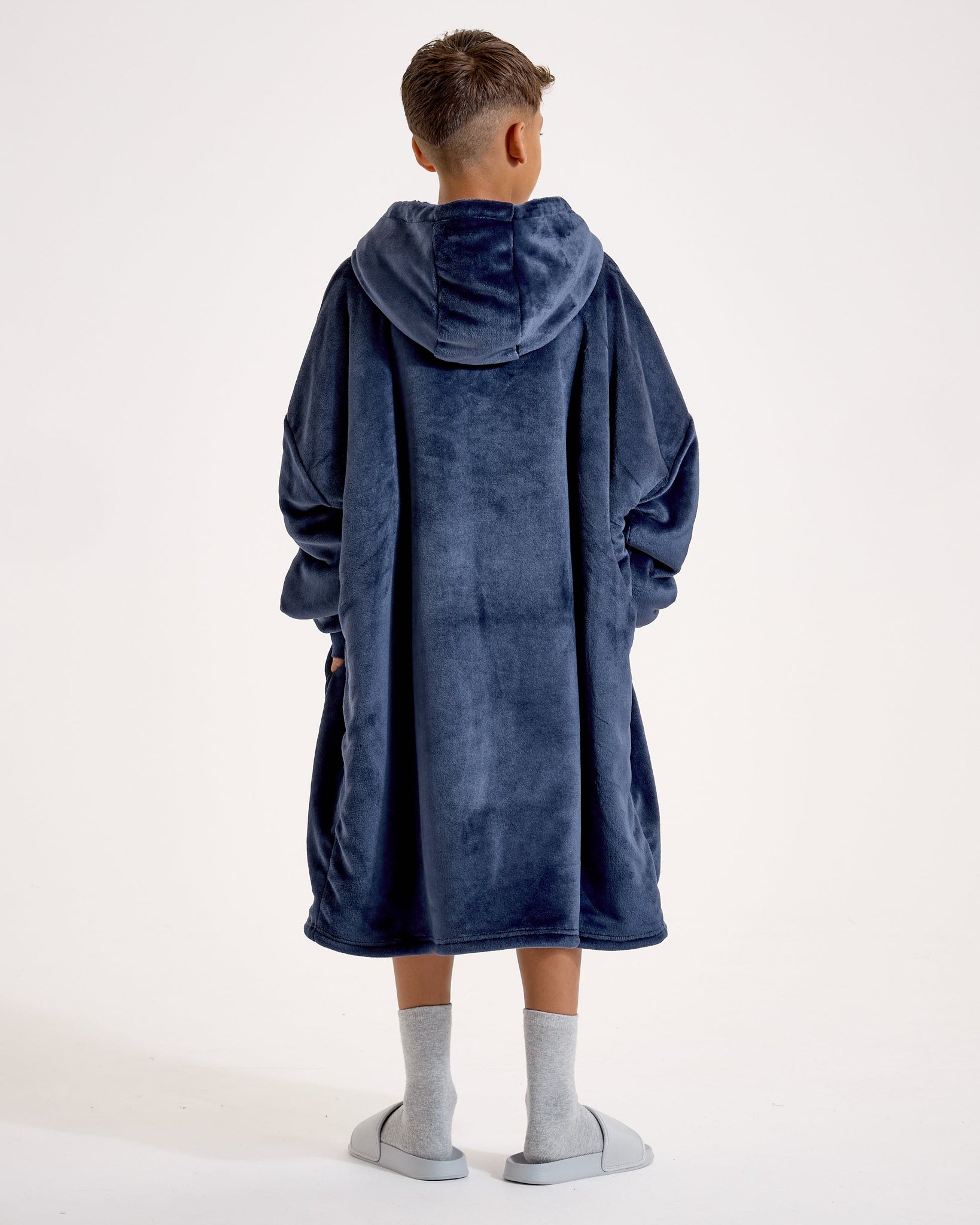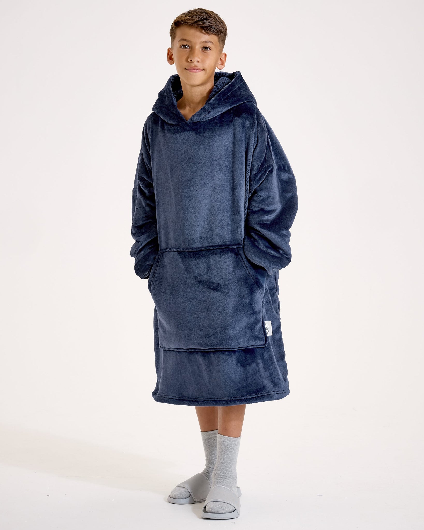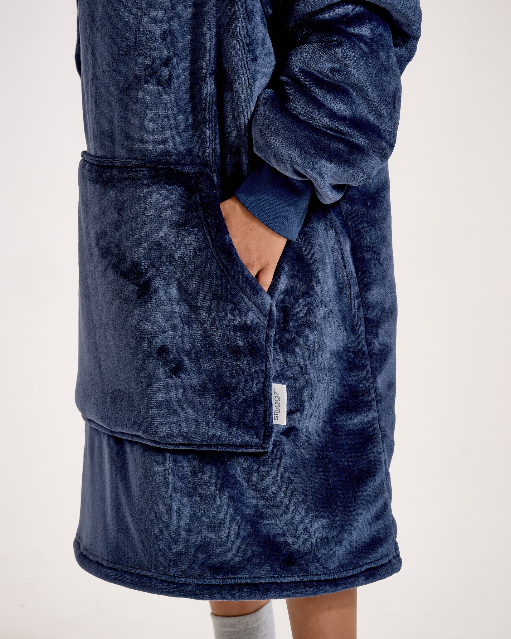 The Snuggz Original Navy Hooded Blanket combines comfort, style, and sustainability. Made with a double-layer design and lined with ultra-soft Sherpa fleece crafted from recycled plastic, this hoodie provides warmth you can feel good about.