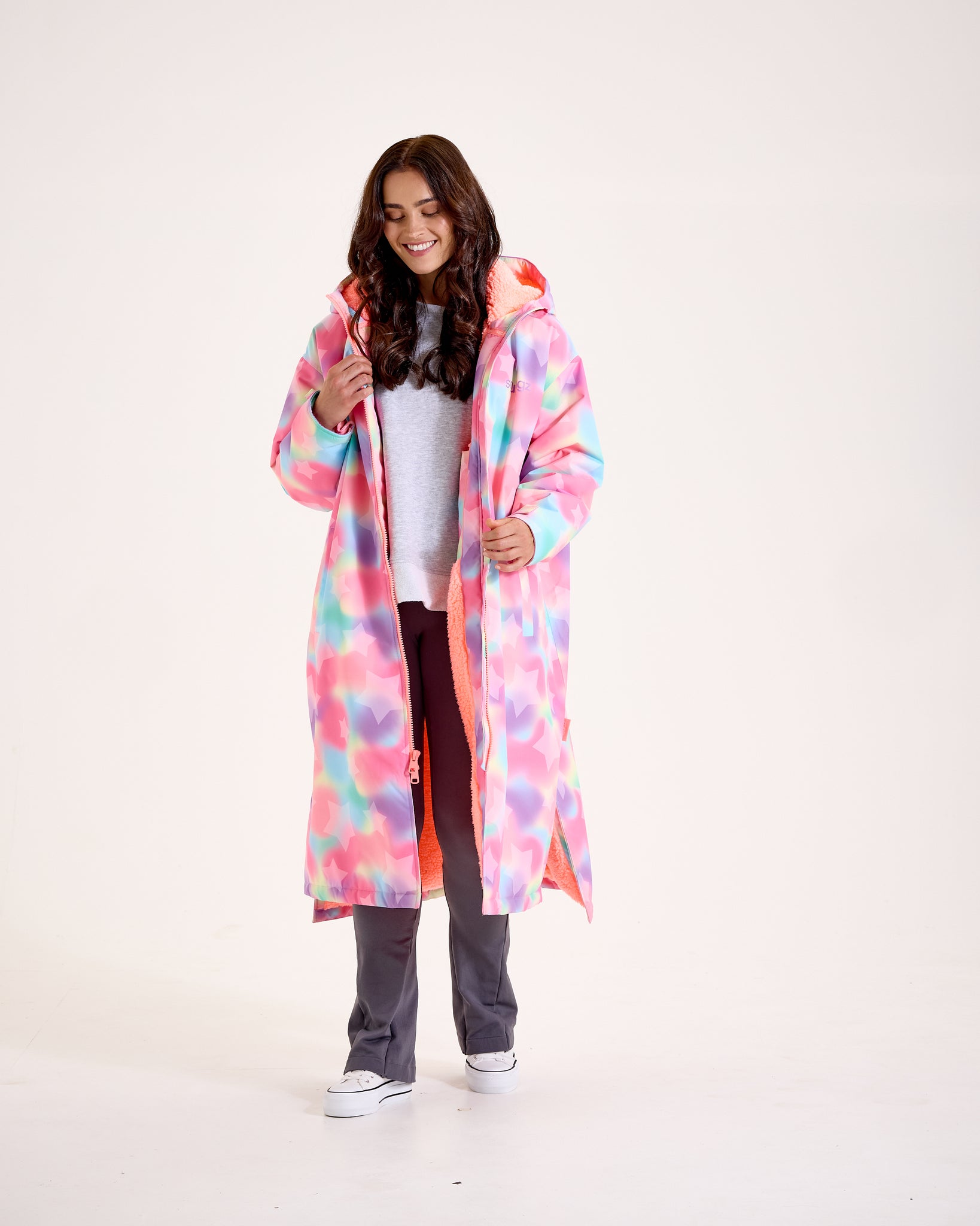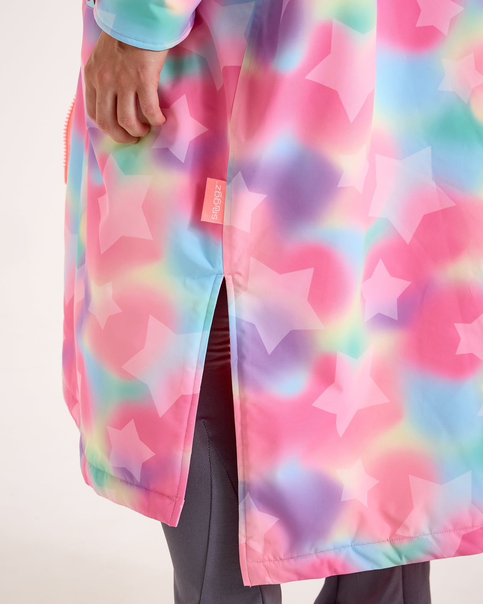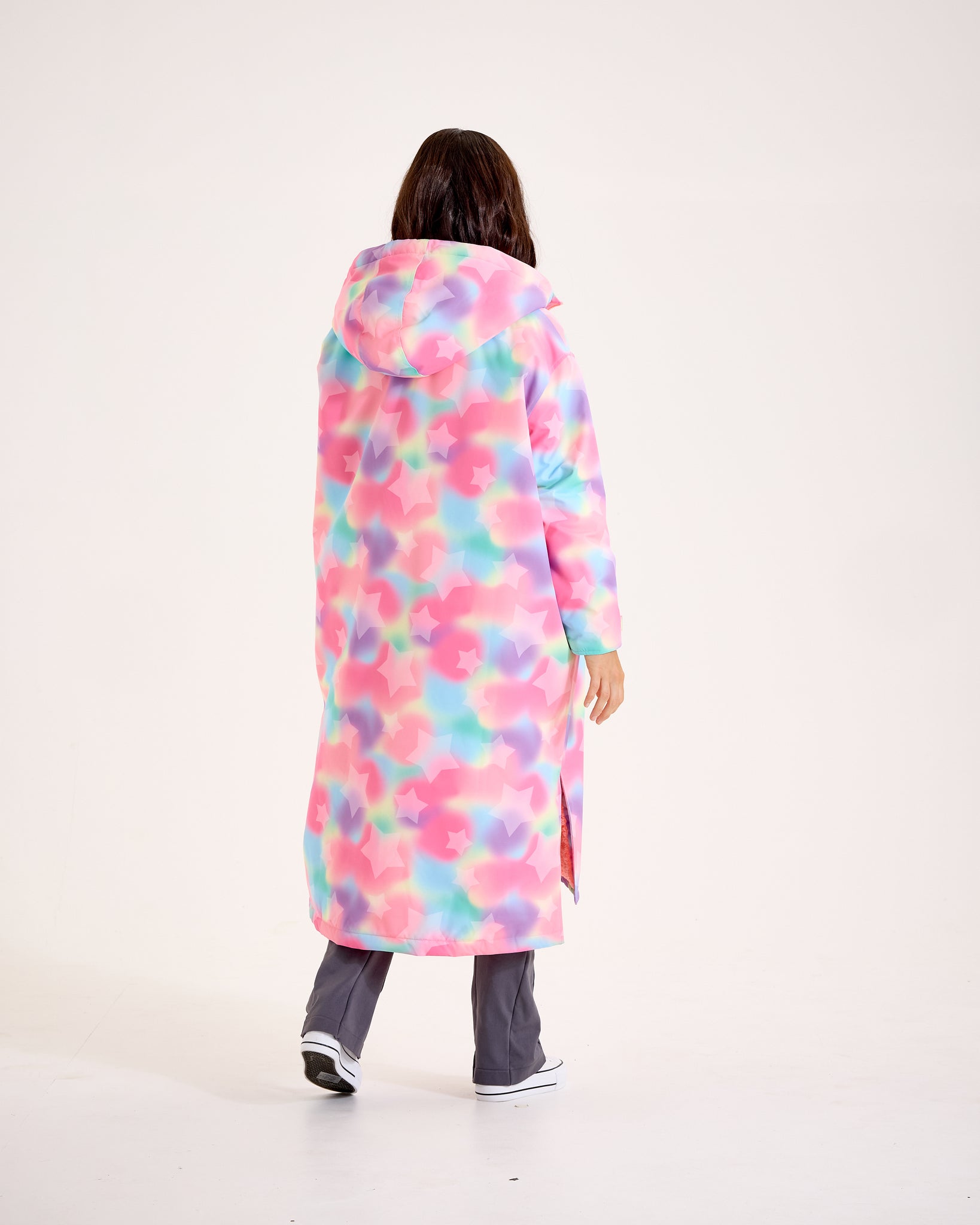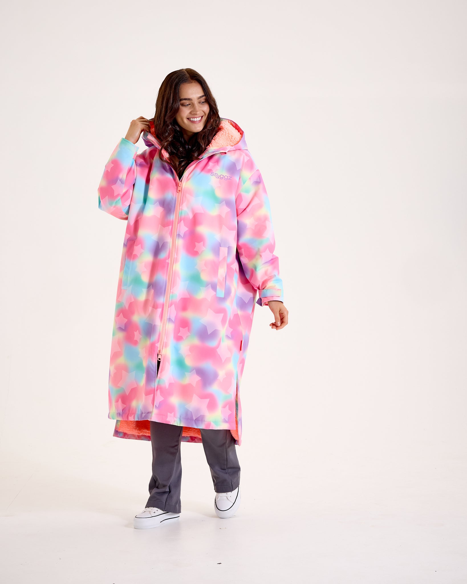 Snuggz Rainbow Star Parka is showerproof and wind-resistant, with a luxuriously soft Borg fleece lining, it’s built for comfort, protection, and style in one oversized package. Designed with a reflective strip on the back for added visibility and safety during low-light adventures.