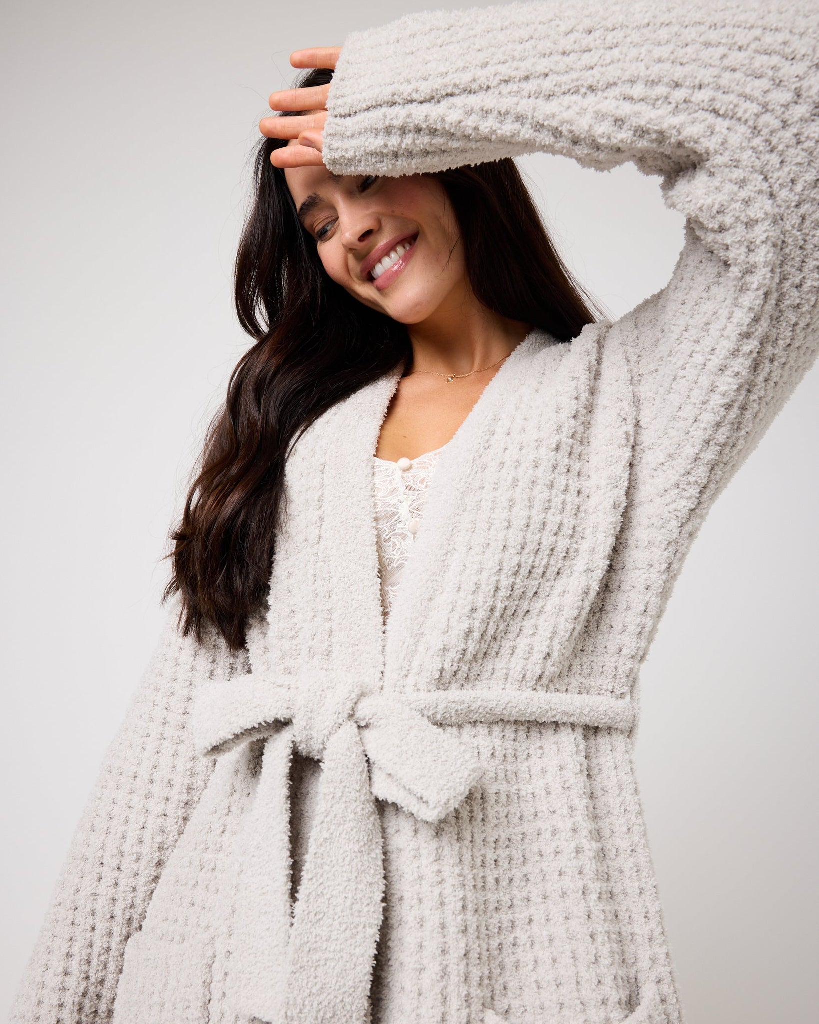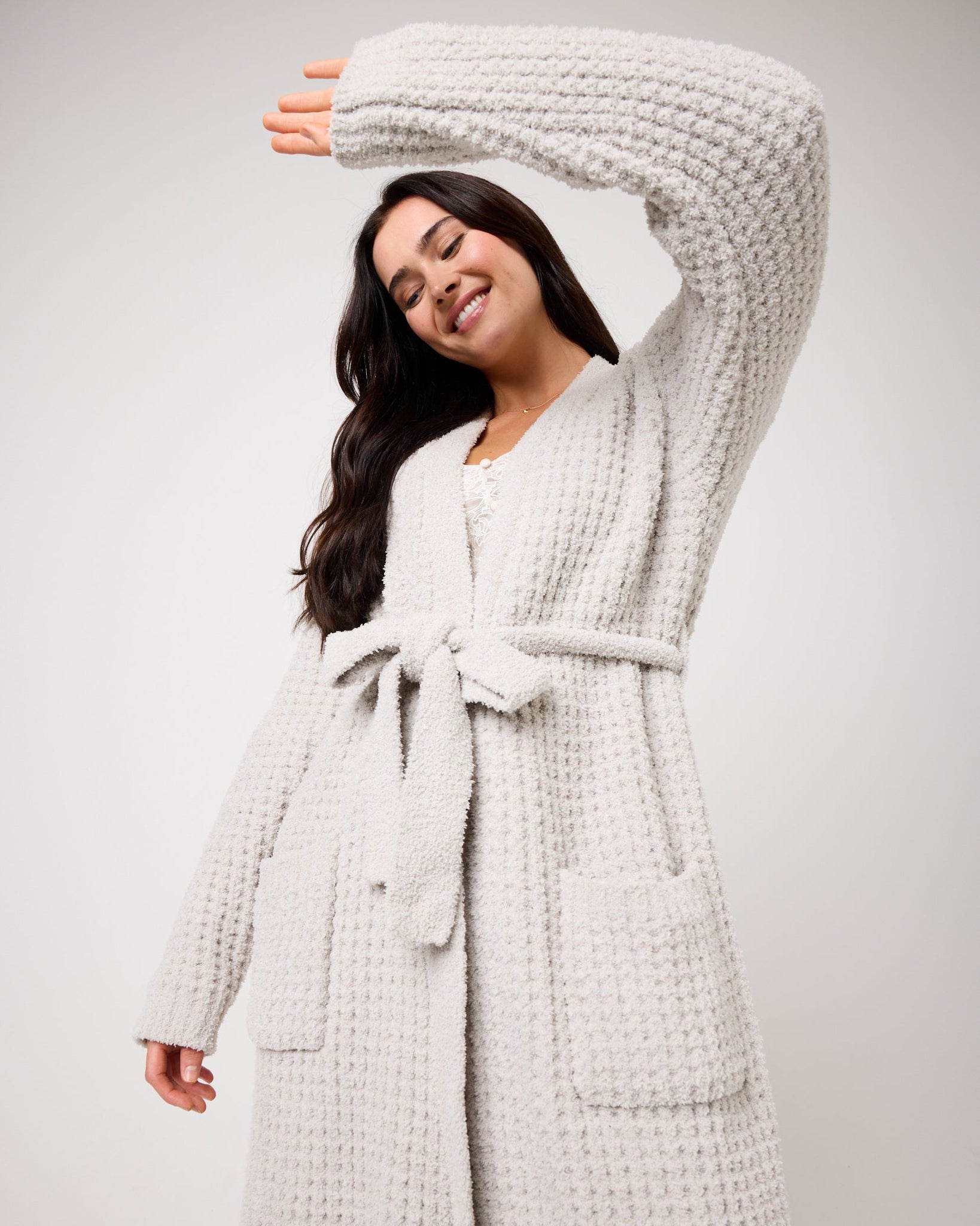Designed with a flattering wrap fit, tie belt, and two handy pockets, it combines understated style with everyday practicality. Whether you’re getting ready for the day or winding down at night, this robe keeps things effortlessly cosy without the bulk.